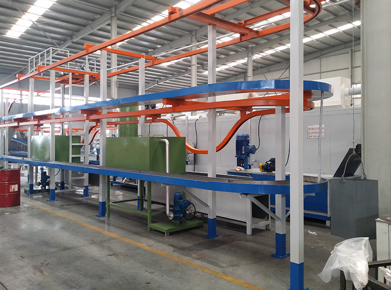 采用噴淋清洗配合液下射流清晰地新型工藝,由于清洗在液下完成,減少煤油在空氣中的霧化,既節(jié)省了生產(chǎn)成本,又提高了產(chǎn)品質(zhì)量。配合懸掛式輸送機(jī)經(jīng)浸防銹油、瀝油、吹干等工藝完成清洗過程。